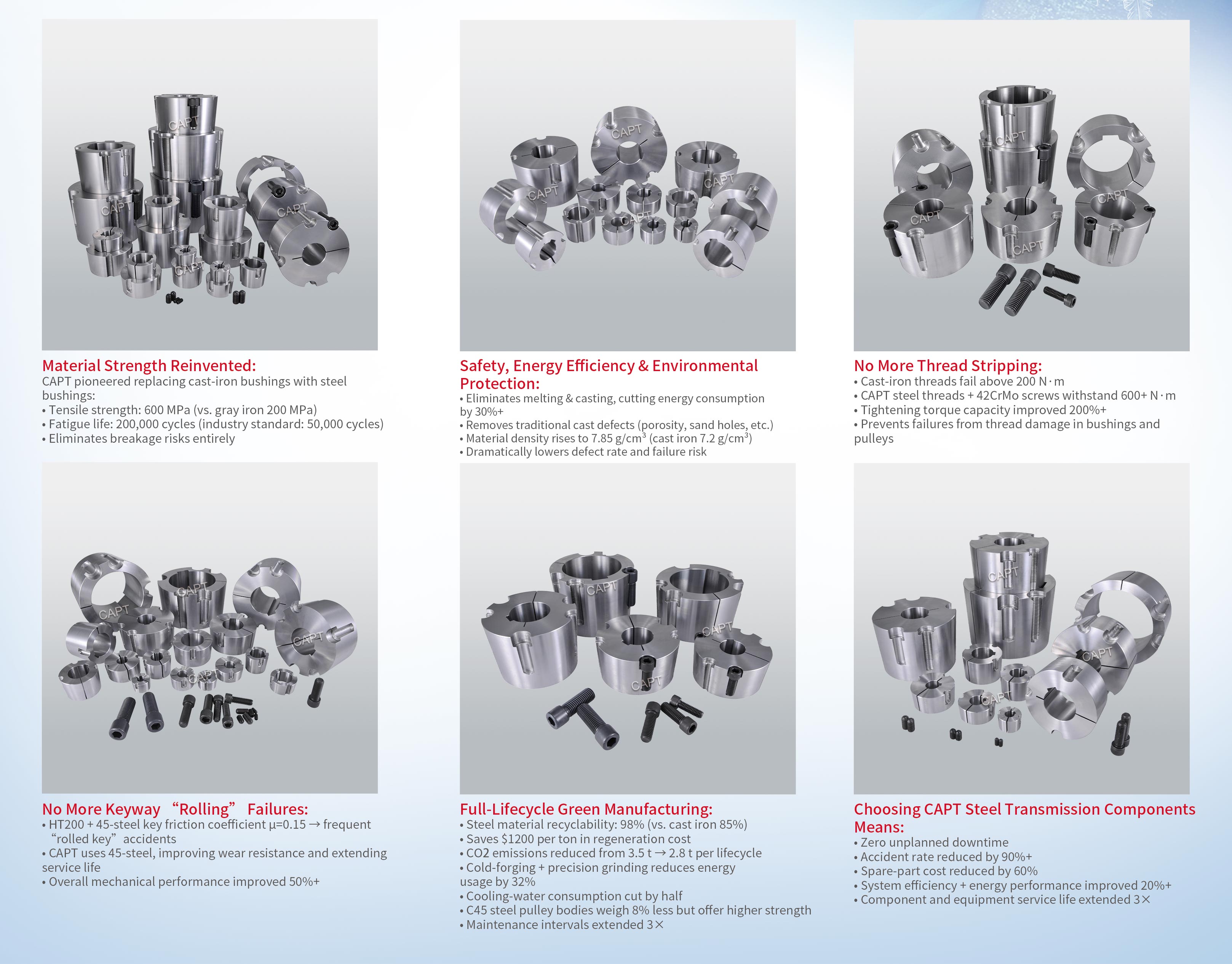 As China’s pioneer in steel taper-bushing R&D and the official drafter of the national taper-bushing standard since 1986, CAPT has dedicated four decades to high-performance transmission manufacturing. Built on high strength, high precision, component zero defects, sustainability, and long service life, CAPT remains the industry leader in upgrading taper bushings, pulleys, and sprockets.