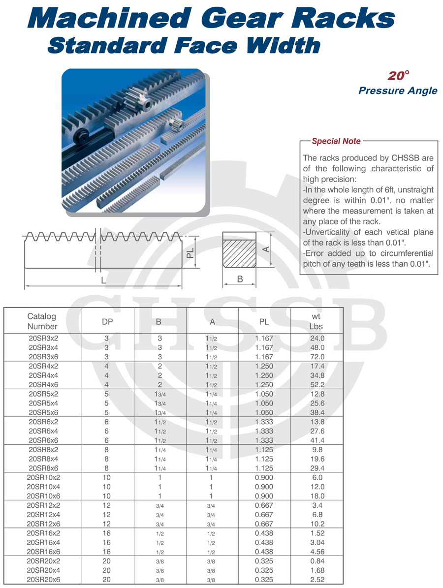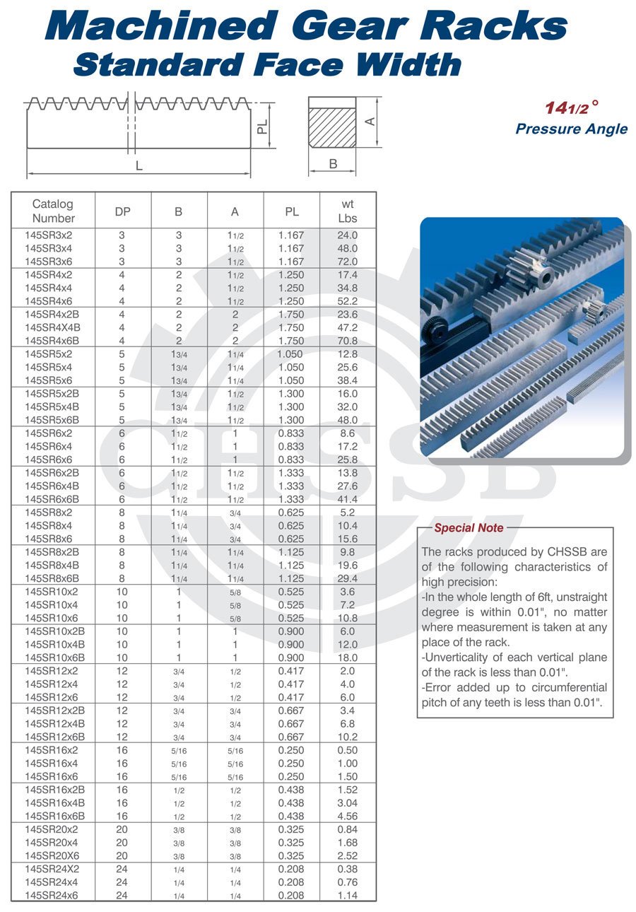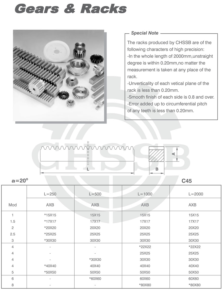 產品范圍: 美標:(14 1/2°/20°) 歐標:(Mod.1-6) 英制尺寸產品(適用于美標市場) 公制尺寸產品(適用于歐標市場) 斜齒條 圓齒條 斜齒齒條 圓齒齒條 SB型齒條 直齒條、牙條、工業齒條、正齒條
