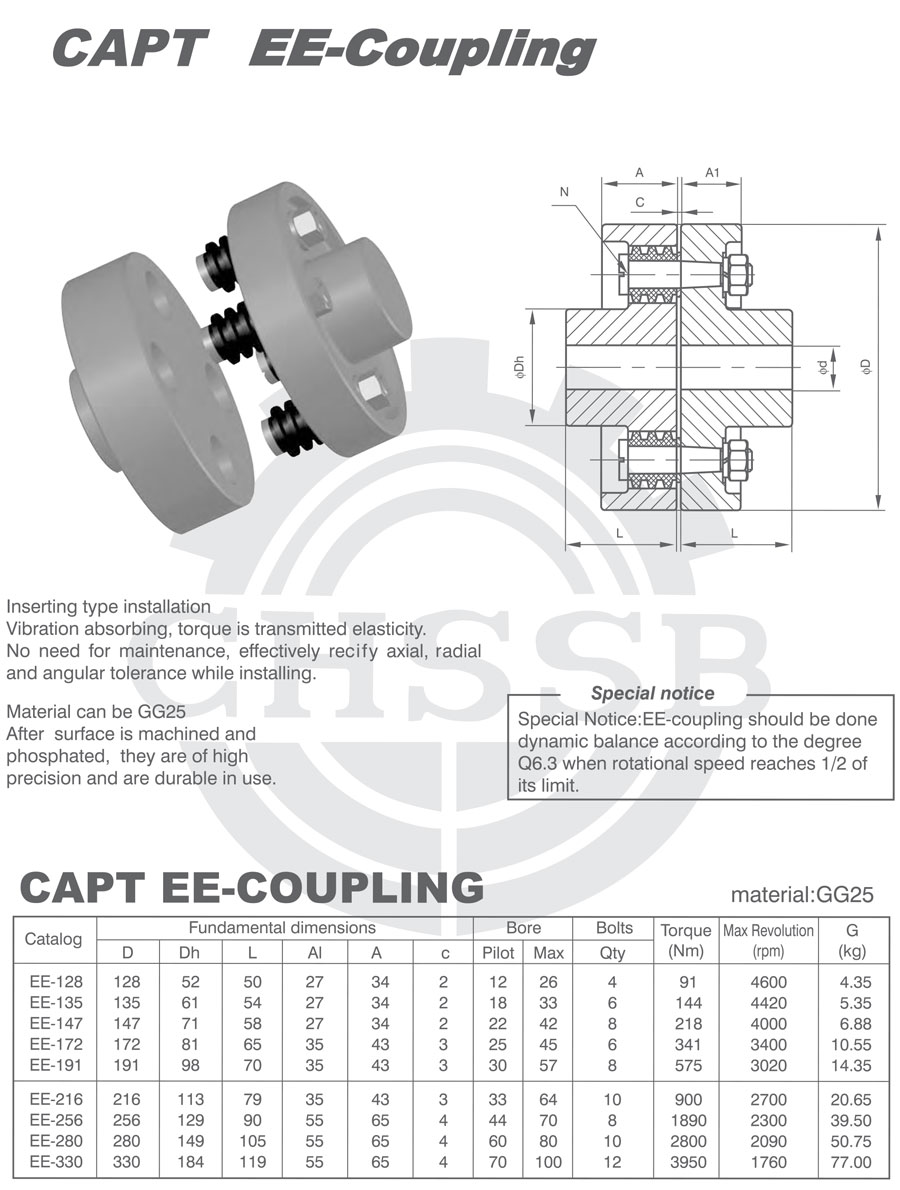 EE聯(lián)軸器插入式安裝;吸收震動,扭向彈性;免維護(hù),有效糾正軸向、徑向、角向的安裝偏差;材質(zhì)可選用